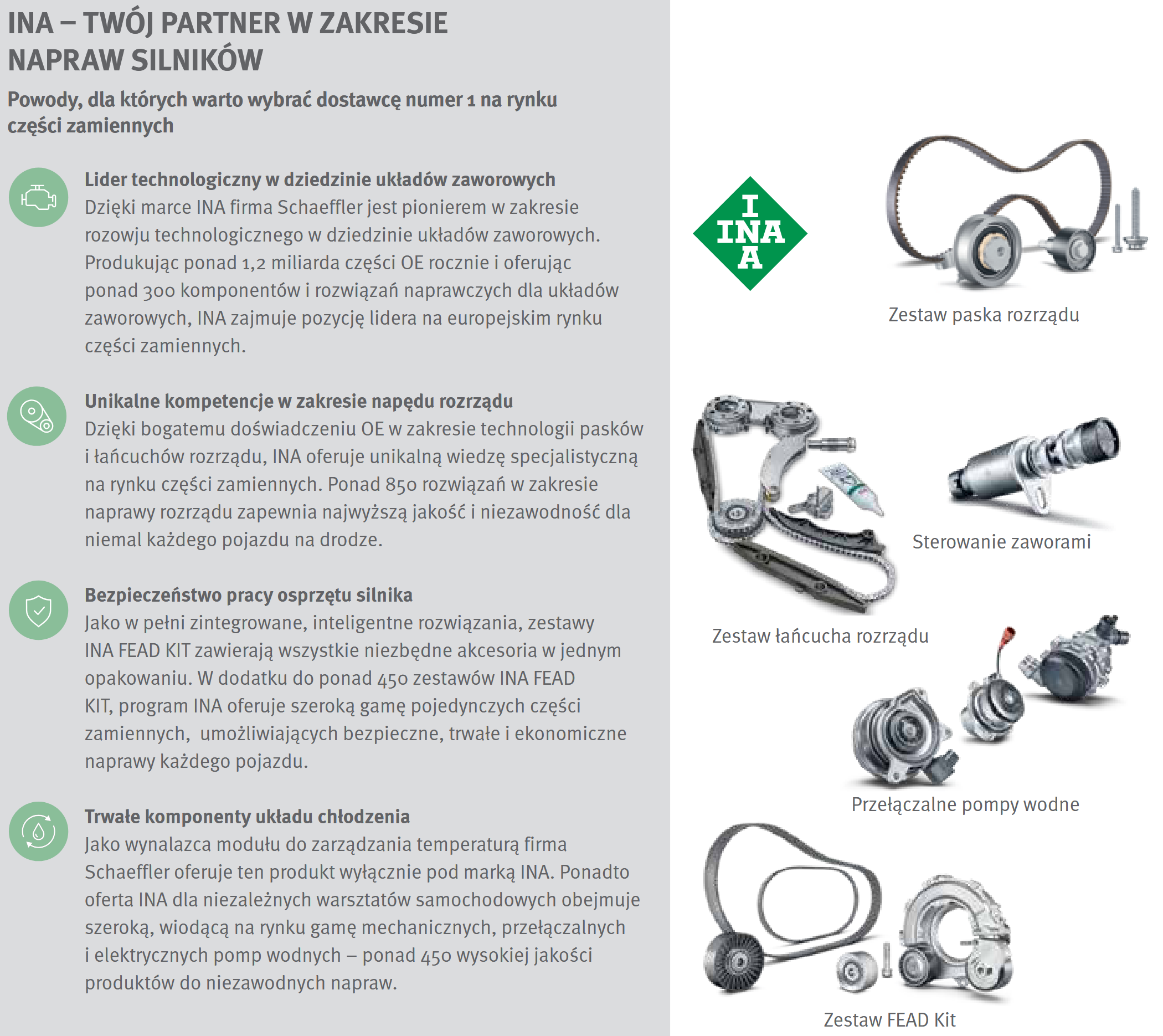 Niezależnie od tego, czy chodzi o samochody osobowe, dostawcze, traktory czy ciężarówki – zakres pojazdów wykorzystujących części INA jest niemal nieograniczony. Dzięki INA wszystkie te pojazdy mogą liczyć na najwyższą precyzję, maksymalną trwałość i wyjątkową jakość. Pod marką INA firma Schaeffler Vehicle Lifetime Solutions oferuje inteligentne zestawy naprawcze dla niezależnego rynku części zamiennych: od układów rozrządu i napędu pomocniczego po sterowanie silnika i układy chłodzenia. Ponadto Schaeffler jest kluczowym partnerem biznesowym wiodących producentów samochodów i dostawcą OE w zakresie przyszłych technologii, takich jak 48-woltowe systemy hybrydowe, które będą odgrywać coraz ważniejszą rolę w konserwacji i naprawach. |