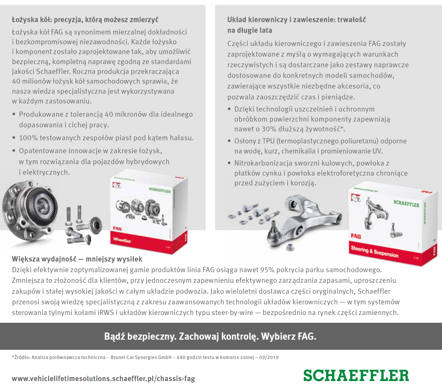 Elementy podwozia FAG zapewniają niezawodność, której ufają warsztaty, oraz osiągi, które doceniają kierowcy.